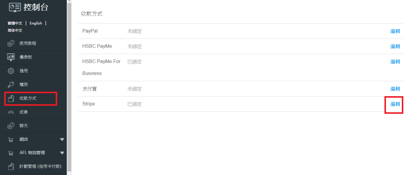 進入網店控制台,點擊Stripe右邊的編輯按鈕