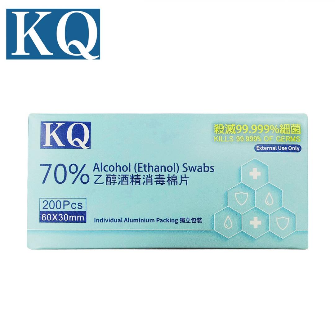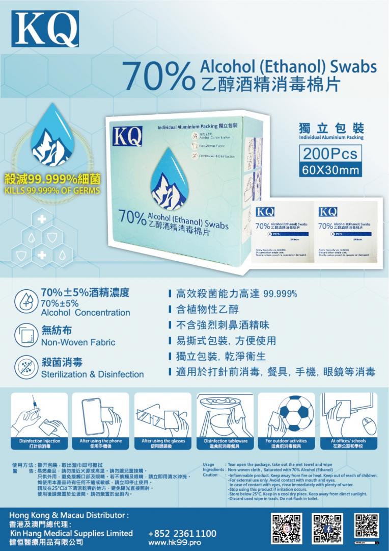 KQ 70%乙醇酒精消毒棉片 200片(獨立包裝) 尺寸: 3 x 6 cm 高效殺菌能力達 99.99%。 使用簡單方便,直接使用。用後不黏手無需沖洗,方便快捷。 植物性乙醇,殺菌力強 氣味清淡,不含強烈刺鼻酒精味 可用於清潔雙手及皮膚,打針前消找毒,餐具消毒,手機清潔,如廁前或後,家居及辦公室清潔,門柄扶手消毒等等。 廠方符合美國食品藥品監督管理局生產要求 注意事項: - 易燃產品,請勿接近火源或高溫。請勿讓兒童接觸。 - 只供外用,避免接觸口服及眼睛。若不慎觸及眼睛,請立即用清水沖洗。 - 如使用本產品是有任何不適或敏感。請立即停止使用。 - 請放在25°C以下清涼乾爽的地方,避免陽光直接照射。 - 使用後請棄置垃圾筒,請勿棄置於坐廁內。 香港及澳門總代理 : 健恒醫療用品有限公司